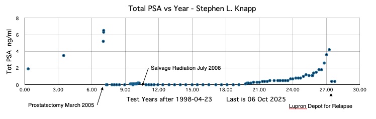 Note: The danger blood concentration for PSA is generally set at or a bit below 4.0 ng/ml. At or above this level a 'Free PSA" test should be made to determine the need for a biopsy for adenocancer (prostate cancer cells). My cancer would have been detected sooner had I had a shorter interval between tests after 6/27/2001. Unfortunately, my family doctor retired just following that date, and I was not alerted to the need for frequent testing, say once a year. I hope this information helps other men, about 10% of whom will develop prostate cancer (many at more advanced ages). Prostate cancer treatment is moving very rapidly at the present time. With regard to the recent (2012) statistical finding that regular PSA testing results in mostly unnecessary treatments and deleterious side-effects, I seem to be the exception: the pathology conducted on my prostate tissues after surgery showed that the cancer had spread outside the prostate "capsule" and was therefore a serious threat. Given my relatively young age (62) at surgery and my overall good health (and lack of comorbidities), I regard myself as fortunate to have been treated. In 2017 my PSA began to rise. Fortunately relapse may be very slow, as shown in the graph. Eventually I will need further treatments. With my PSA increasing, in May 2025 I was put on long term androgen suppression with Lupron Depot. [I had undergone a one year course of Lupron following prostatectomy in 2005.] The initial PSA following the Lupron is encouraging. |
